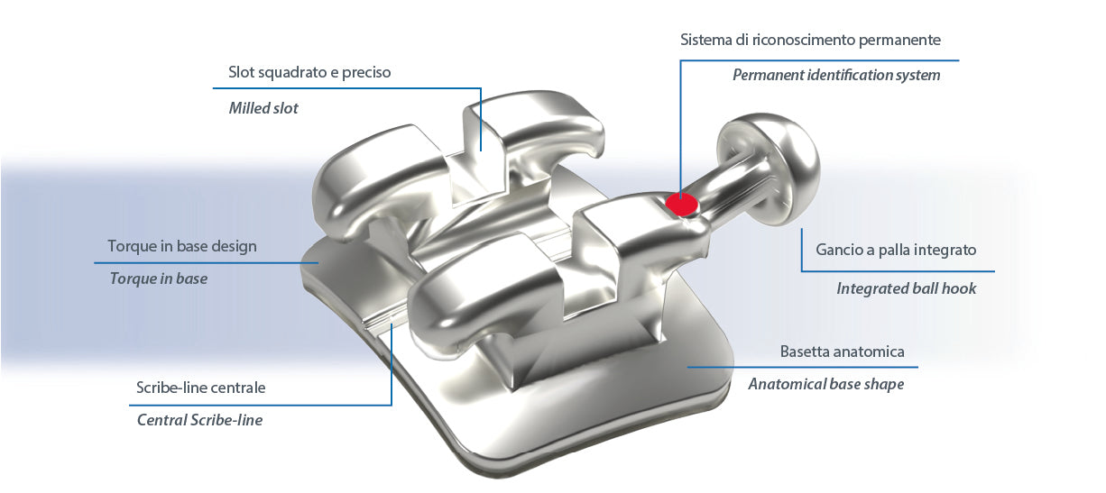 Manufactured by MIM technology, its strong mechanical retention is granted by several micro grooves and a sandblasted treatment under each bondable base. Available in Roth and MBT prescriptions with slot 0.018 or 0.022. Its rhomboidal shape, the torque-in-base